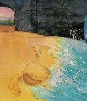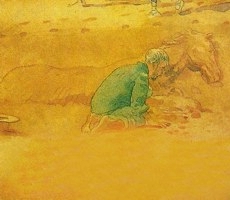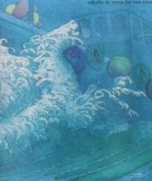 ![]() | Trabajó hasta la puesta del sol, cuando se sintió el frio en la playa. Entonces, las familias empezaron a irse, plegando sus sillas de tijera y sacudiéndose la arena. El artista recoge, las monedas de su sombrero y -también partió. Al quedarse solo, el caballo de arena comenzó a despertar. Estaba vivo, pero no podía moverse. Abrió su único ojo, pero solo veía nubes. Con su único oído escuchó las gaviotas, el rugir y suspirar del mar. Y, mezclados con los estallidos de las olas, oyó suaves, casi imperceptibles relinchos. |