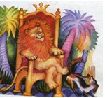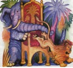 llegó el elefante barritando, asustando al leó y dijo: "Yo seré el rey" y se sentó en el trono,