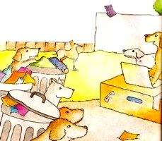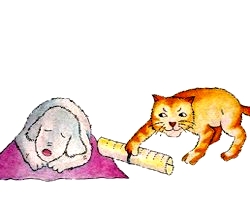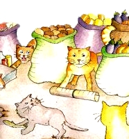![]() | Gato ladrón: ¡Compañeros! Eh descubierto algo, que los perros tienen derechos y nosotros no, un rey le concedió los derechos y a nosotros nada. Se levanta el Gato Garabato y dice: ¡No puede ser! Nosotros... que somos tan guapos, tan distinguidos y elegantes... que adornamos las casas y somos tan limpios...nos dejan sin derechos. Todos maúllan furiosos El Gato ladrón dice: La solución es esconder este papel para que así los perros no puedan probar sus derechos. Todos los gatos: Si... si... escondan el papel Entonces esconden el papel debajo de la basura y se van. |